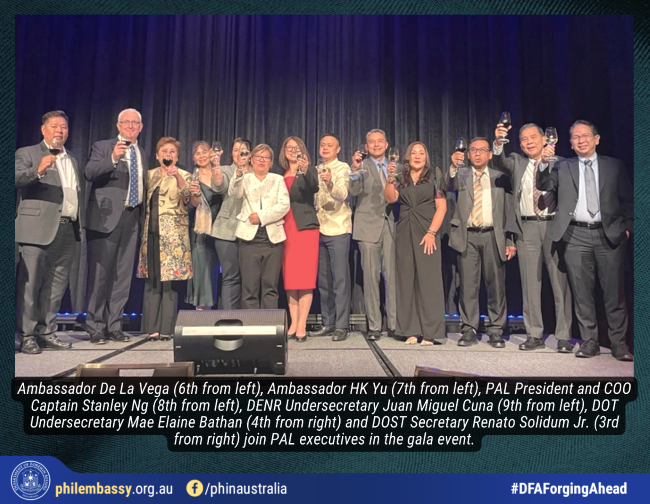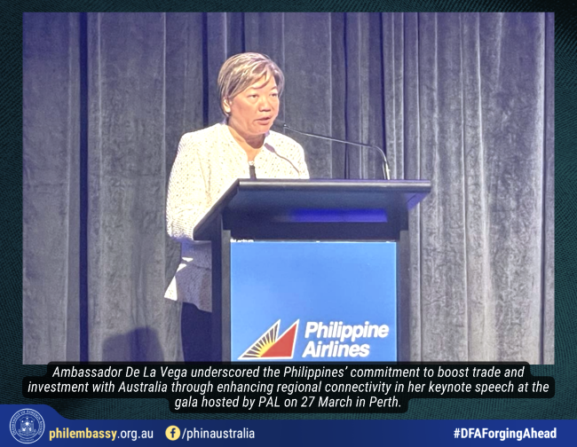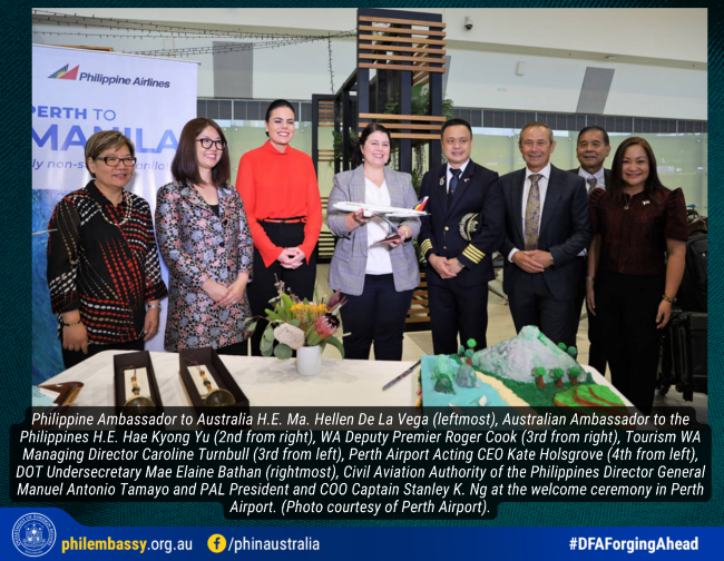 In her keynote speech at PAL’s Gala event, Ambassador De La Vega emphasized that the new direct flights from Manila to Perth demonstrates the steadfast commitment of the Philippines to advancing its partnership with Australia through the enhancement of regional connectivity. The participation of a high-level mining and business delegation from the Philippines onboard the maiden flight is indicative of the commercial opportunities that the nonstop flight brings and the importance of establishing pathways to prosperity. The direct flights will serve as a major boost for people-to-people exchanges, reinforce personal and professional ties and enhance bilateral cooperation, trade and investment.
