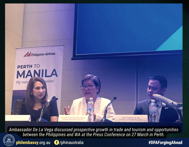 Speaking at the press conference, Ambassador De La Vega highlighted that WA hosts more than 46,000 Filipinos which is the fifth largest overseas population in the state and that Filipinos also comprise the fifth largest diaspora community in Australia. Noting that there is no time difference between the Philippines and WA, she stated that the figures are expected to continue growing as the direct flight will provide greater accessibility and convenience to travelers.