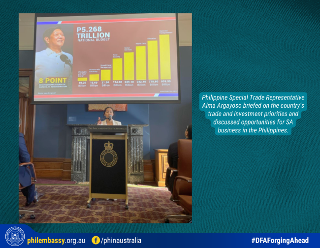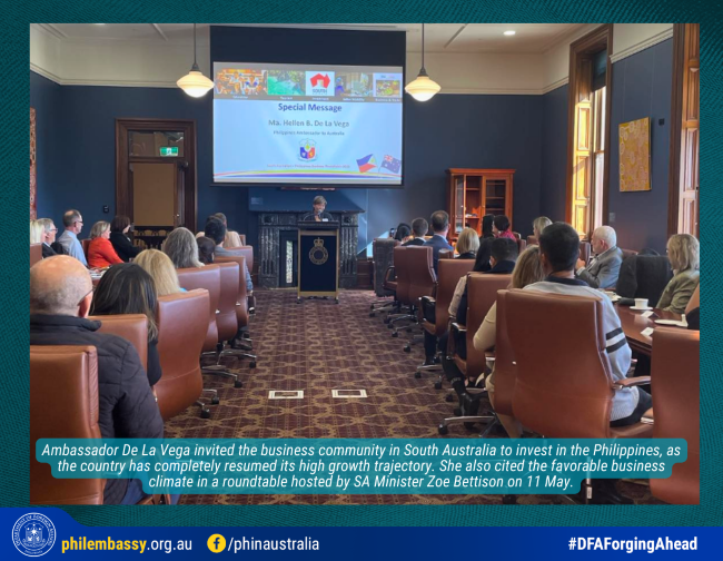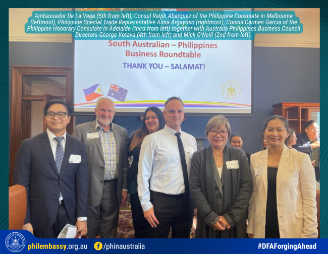 Ambassador De La Vega underscored the importance of maintaining strong and meaningful partnerships as the Philippines and Australia celebrate 77 years of enduring diplomatic relations in May 2023 and further encouraged business representatives in SA to seize opportunities in the Philippines. -- END