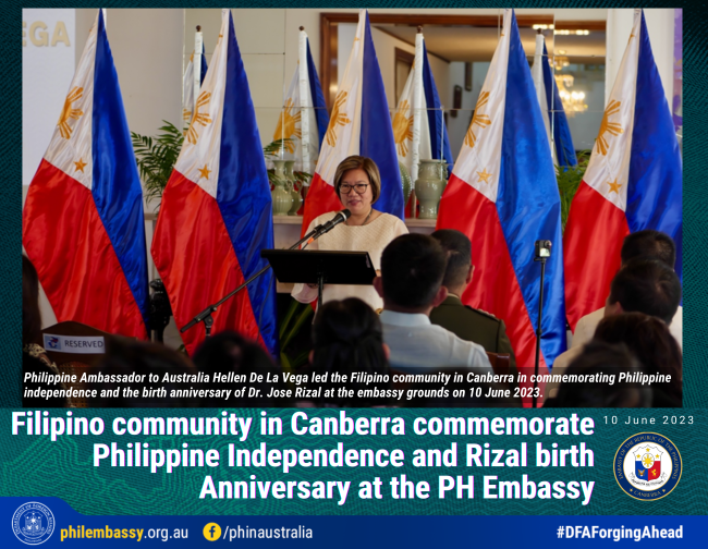 Philippine Ambassador to Australia Ma. Hellen B. De La Vega led the Filipino community in Canberra in commemorating the 125th anniversary of the declaration of the independence of the Philippines and the 162nd birth anniversary of national hero D...