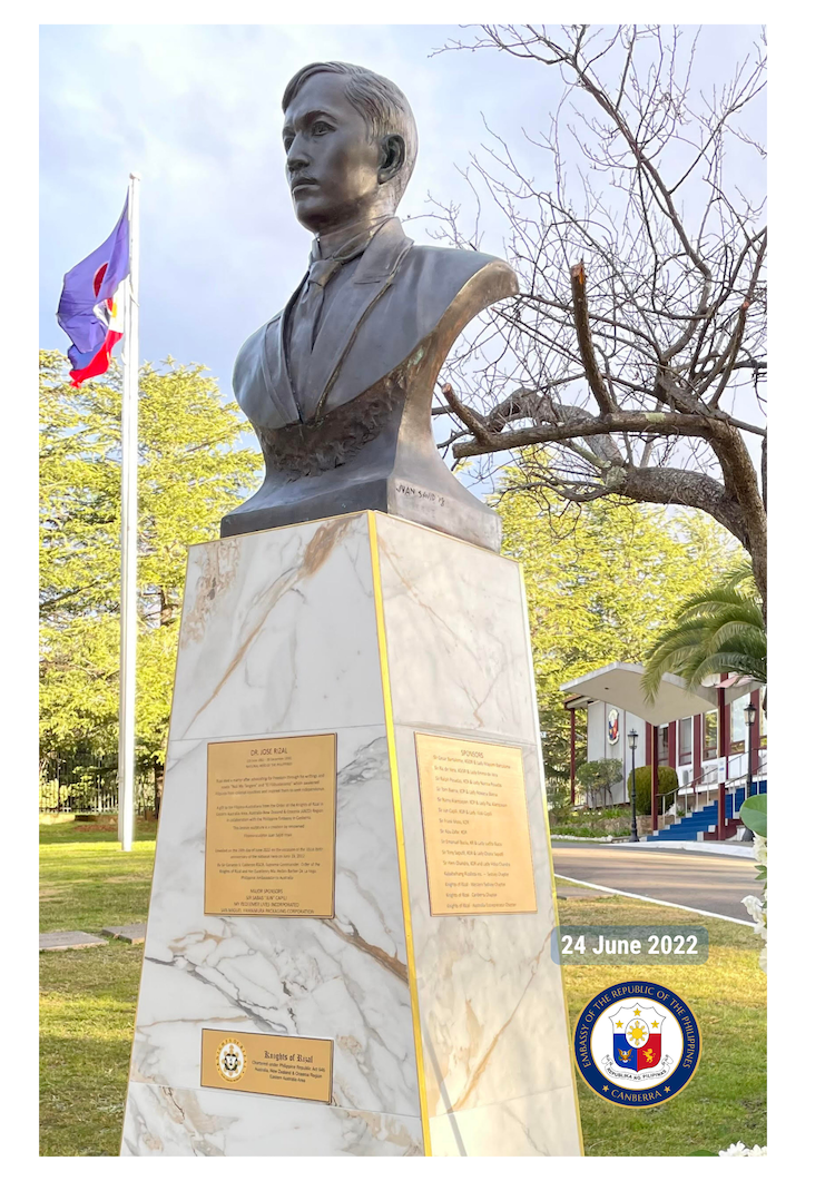 The Philippine Embassy in Canberra Australia celebrated the 161st Birth Anniversary of Dr. Jose Rizal with the unveiling of Rizal’s bust at the Embassy grounds and the chartering of Kababaihang Rizalista (KRI), Canberra Chapter on 24 June 2022.